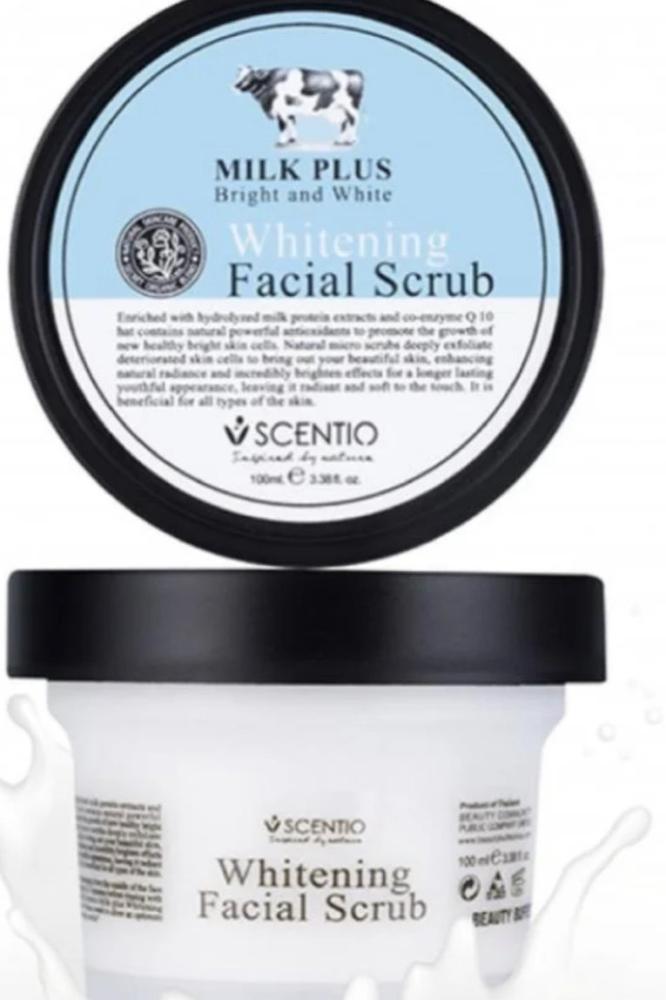 يحتوي المقشر على بروتين الحليب المتحلل ومساعد الإنزيم Q10 الذي يعمل على إصلاح البشرة وتبييضها والمحافظة على شبابها وحيويتها.